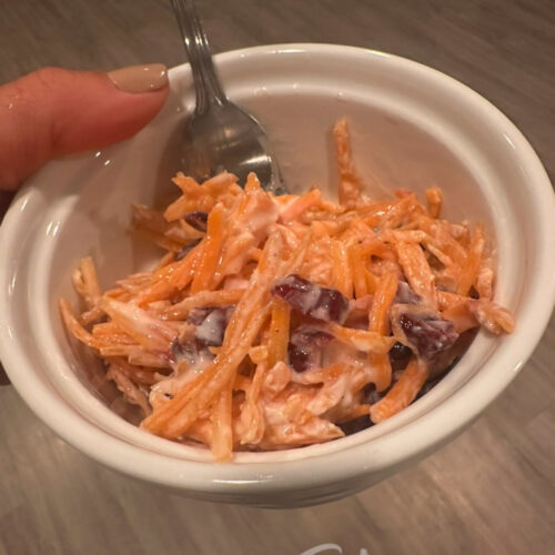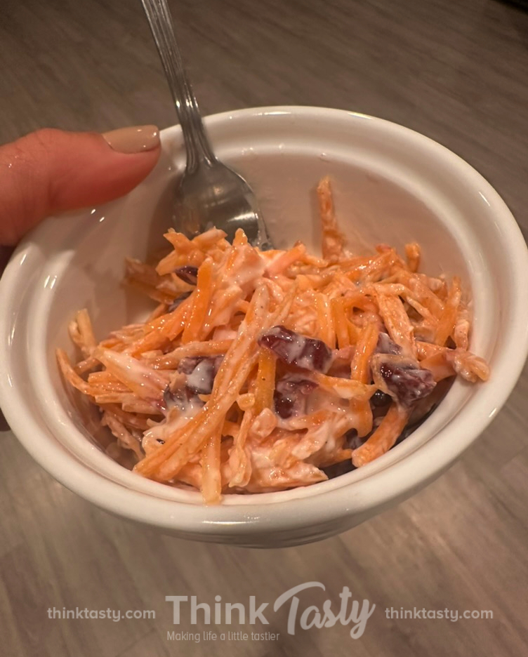 Everyone enjoyed the salad. It has a hint of sweetness and a hint of spice. Plus, it is healthy, as the dressing is made with Greek yogurt. No need for mayonnaise or sour cream in this dish. I think that this will be my go-to carrot salad recipe in the future. Not only do I always have dried cranberries on hand, but the addition of cinnamon (which I don’t use with pineapple) really made this salad extra special.